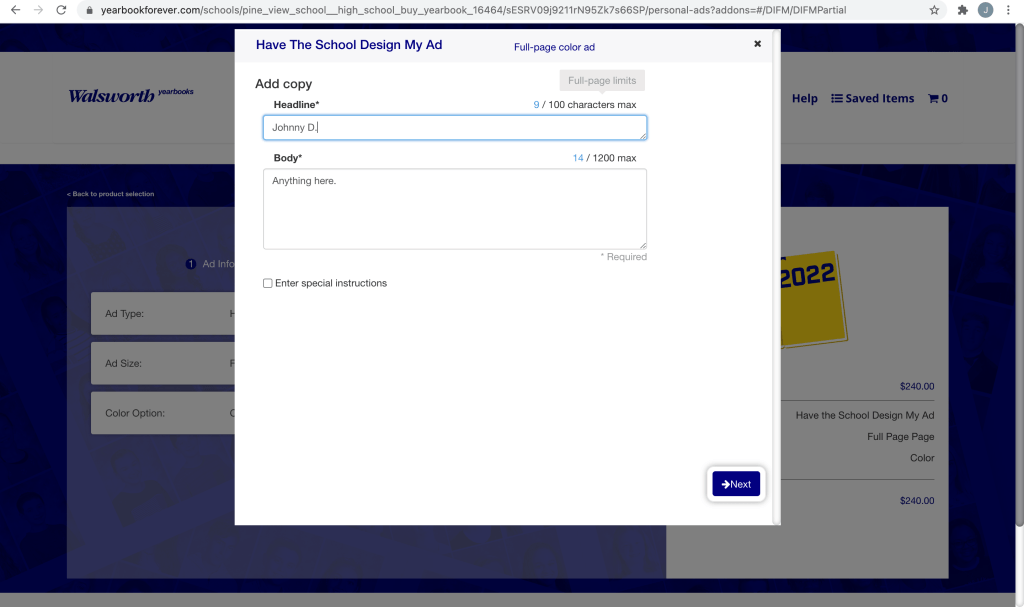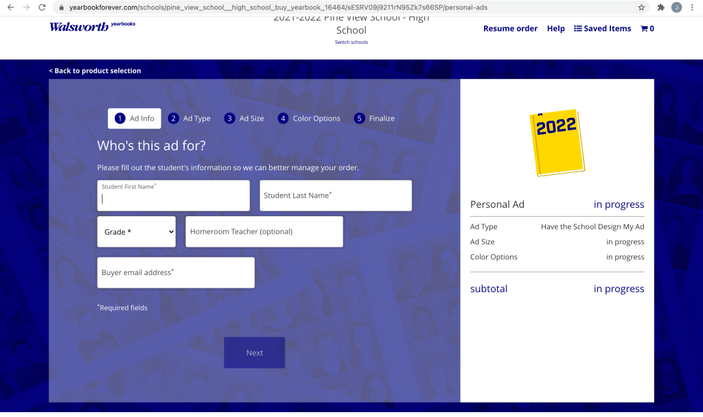 1st Step: You must fill out your information, you must use your full legal name. After that you may choose the size of your page before finalizing it. If you are having trouble clicking “next” please make sure to clear your cache, if this does not work try going into an incognito window. Email us with any problems.